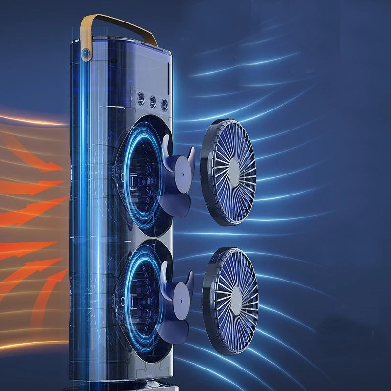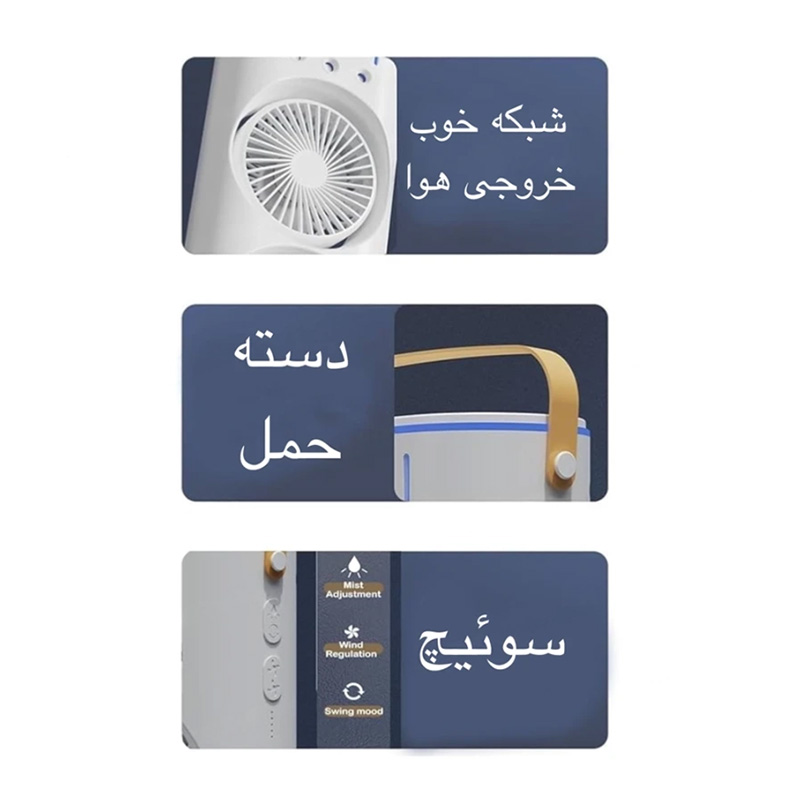 سه تنظیم سرعت به شما اجازه میدهد تا خروجی را مطابق با ترجیح خود تنظیم کنید. شما میتوانید خروجی پنکه را رو به بالا و پایین تنظیم کنید تا هوا در جهات مختلف گردش کند. با دو عددی جمع شدن باد قدرت باد 90 درصد افزایش می یابد. باد قوی تولید میکند که به شما کمک میکند گرما را تحمل کرده و تازه بمانید. عملکرد آن باعث نمیشود کار یا خواب شما مختل شود و اندازه جمعوجور و ساختار سبک فن، حمل آن را آسان میکند. سبک وزن و قابل حمل با جابجایی آسان است که در صورت نیاز می توانید آن را به راحتی به اتاق های مختلف منتقل کنید. دو فن چرخشی مستقل و سه حالت اسپری آب، رقص نور و مخزن آب 280 میلی لیتری و قابلیت چرخش برای ارائه یک تجربه خنک کننده آرامش بخش و لذت بخش طراحی شده است.