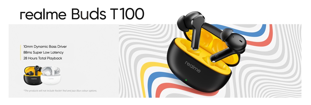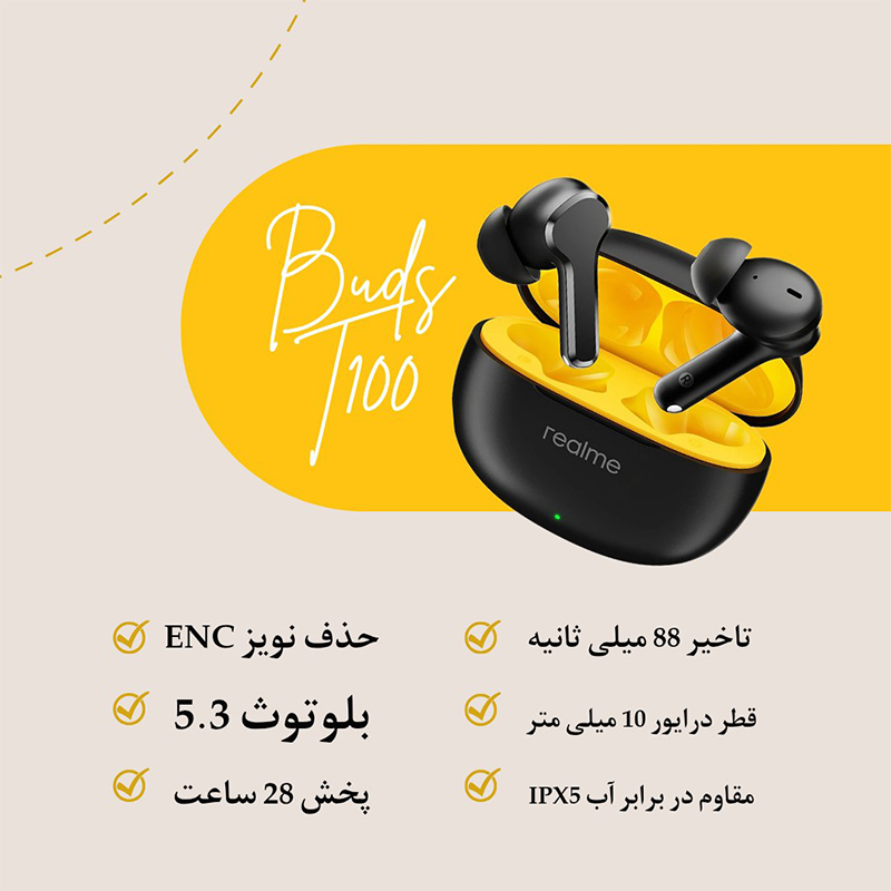 هدفون بلوتوثی ریلمی مدل Realme Buds T100 مجهز به دو هدفون با پایههای نسبتاً بلند و سر سیلیکونی گوشیها میباشد. که این دو ویژگی به ترتیب چفت شدن در گوش را تضمین کرده و بیس عمیقتر، نویز کمتر و تداخلات کمتر را ایجاده کرده و عملکرد خوبی در مکالمه ارائه میدهد. این هدفون ها که برای راحتی طراحی شده اند، دارای طراحی سبک و ارگونومیک هستند که متناسب با فرم گوش طراحی شده اند و امکان استفاده طولانی مدت بدون ناراحتی را فراهم می کند. 4 گرم وزن دارند و ابعاد بسیار کوچک و وزن سبک این محصولات سبب میشود تا برای استفاده طولانیمدت، یک گزینه ایدهآل باشند. از بین سر گوشی های موجود در 3 سایز، یکی را انتخاب کنید تا مطمئن شوید که به راحتی در گوشتان قرار میگیرد. همین کارنویز را مسدود میکند و تضمین میکند که گوش های شما فقط با یک تجربه موسیقی فراگیر پر میشوند. چه در یک خیابان باشید و چه در یک واگن مترو، میتوانید در آن سوی خط به وضوح صدای خود را بشنوید.
