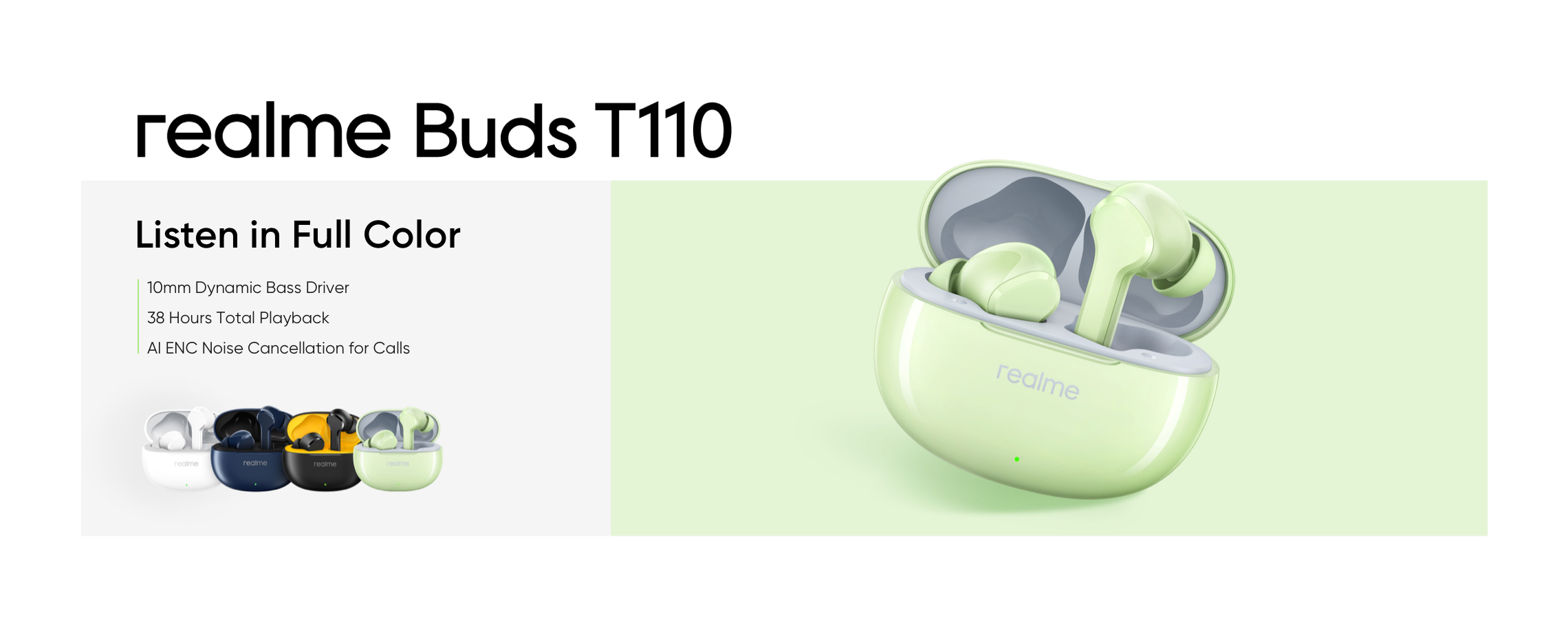 از اپلیکیشن realme link استفاده کنید تا ویژگی های هیجان انگیزتری را فعال کنید. درایورهای بیس دینامیک 10 میلی متری و دیافراگم های گنبدی، هر فرکانس را به سطح بالاتری میبرند. لایه های مختلف با هم کار میکنند تا بیس غنی و قدرتمند و فرکانس های میانی و بالایی شفاف ارائه دهند. با درایور 10 میلی متری، فناوری حذف نویز AI ENC و بلوتوث نسخه 5.4، مدل T110 تجربه ای بی نقص از موسیقی و مکالمه را فراهم میکند.طراحی ارگونومیک، مقاومت در برابر آب IPX5 و عمر باتری تا 38 ساعت با کیس شارژ، این هندزفری را به انتخابی عالی برای استفاده ی روزمره تبدیل کرده است.
