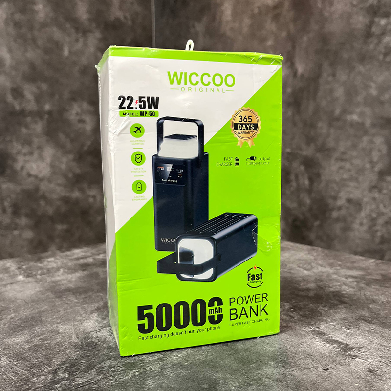 پاوربانک 50000 میلی آمپر ویکو مدل Wiccoo WP-50 با ظرفیت 50000 میلی آمپر ساعت با باتری لیتیوم پلیمری و طراحی خاص و وزن سبک و قابل حملش امکان شارژ دستگاههایی مانند گوشیهای هوشمند، تبلتها، دوربینهای دیجیتال و دستگاههای دیگر را در هر زمان و مکانی به شما میدهد. میتوانید از آن در منزل یا سفر استفاده کنید، با قابلیت شارژ سریع خود در کمترین زمان ممکن گوشی شما را شارژ میکند.